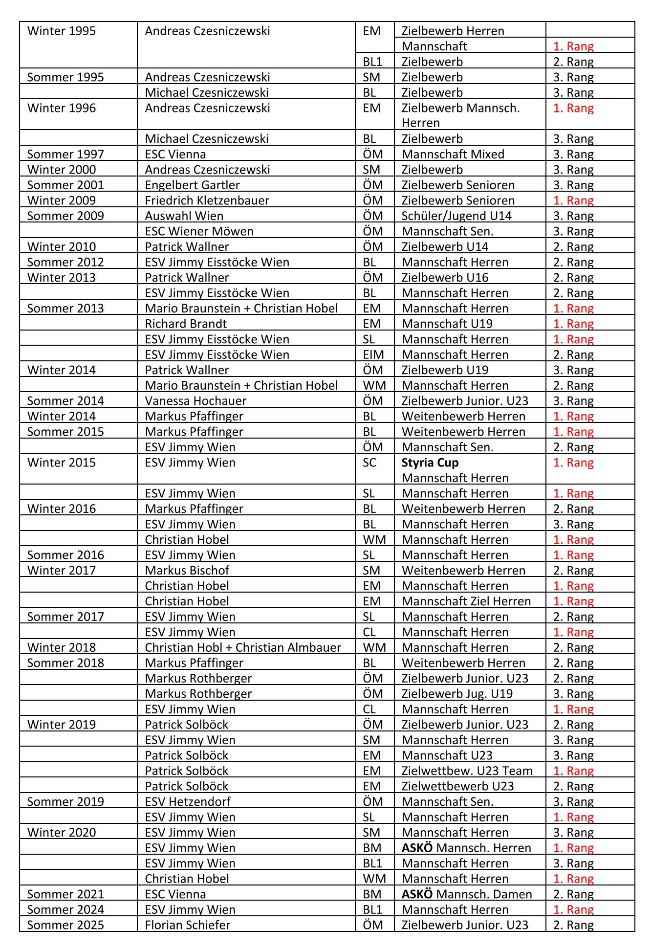 Hervorzuheben ist die starke Leistung von Florian Schiefer (ESV Jimmy Wien), der bei den Junioren U23 den zweiten Platz belegte und zudem bei den Herren einen respektablen 8. Rang erreichte. Auch Philip Traunwieser (ESV Jimmy Wien) konnte mit einem 5. Platz bei den Junioren U23 eine gute Platzierung erzielen. Bei den Seniorinnen Ü50 überzeugte Helena Hochschorner (1. ESV Leopoldau) mit einem 9. Platz unter 17 Teilnehmerinnen. Ebenfalls erfreulich ist das Ergebnis von Stella Schmid (ESV Hetzendorf), die sich in der Kategorie Schüler/Jugend U14 weiblich mit Platz 10 im Teilnehmerfeld von 18 Mädchen gut behauptete.